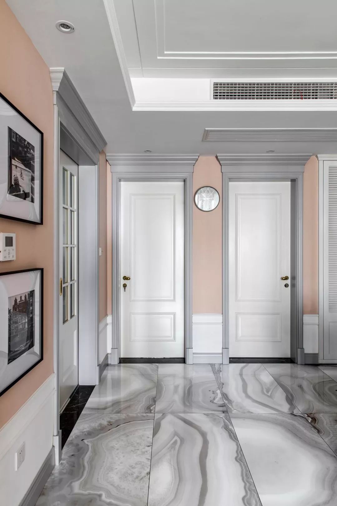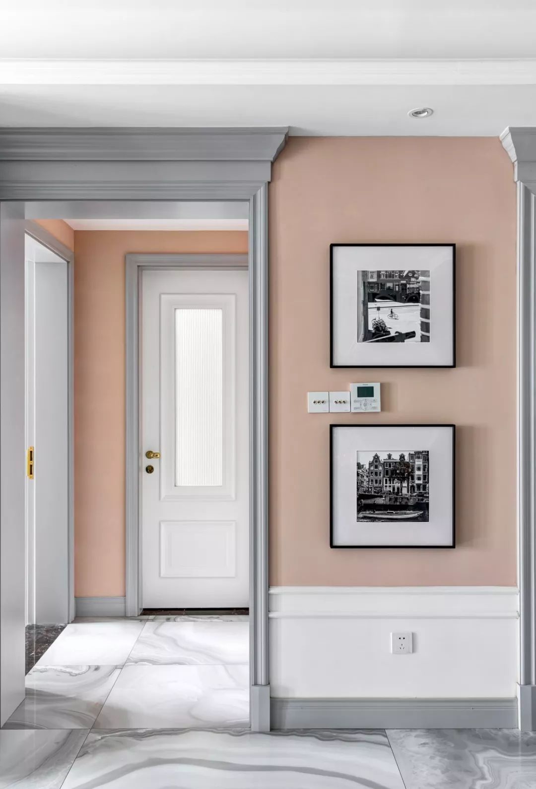 门头线条,延续整个空间,同门套和踢脚线,选用烟灰色,与白色半高护墙、粉色墙面,三色相呼应;