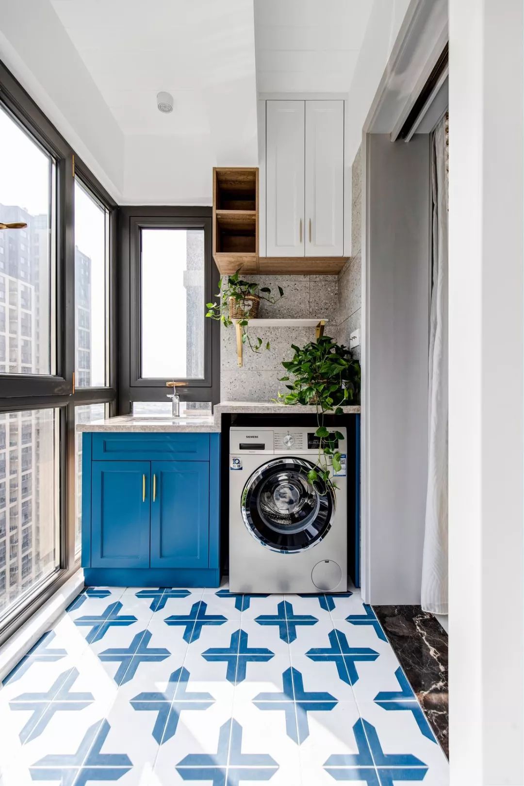 阳台一侧,洗漱池与洗衣机台面高低错落,顶部有效的空间都定制了收纳柜,颜值与功能兼得;地面选用蓝色系拼花地砖,呼应整体色调。