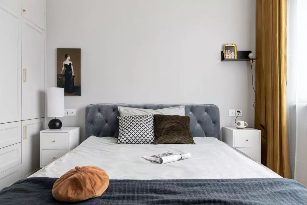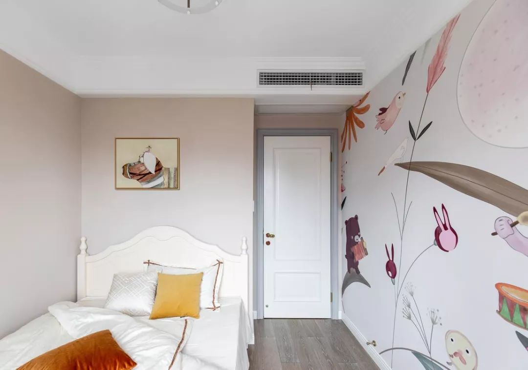 儿童房做了成长式设计,业主有一对可爱的双胞胎女儿,双方的父母都需要来照顾孩子,暂时给长辈使用,一面墙童趣壁