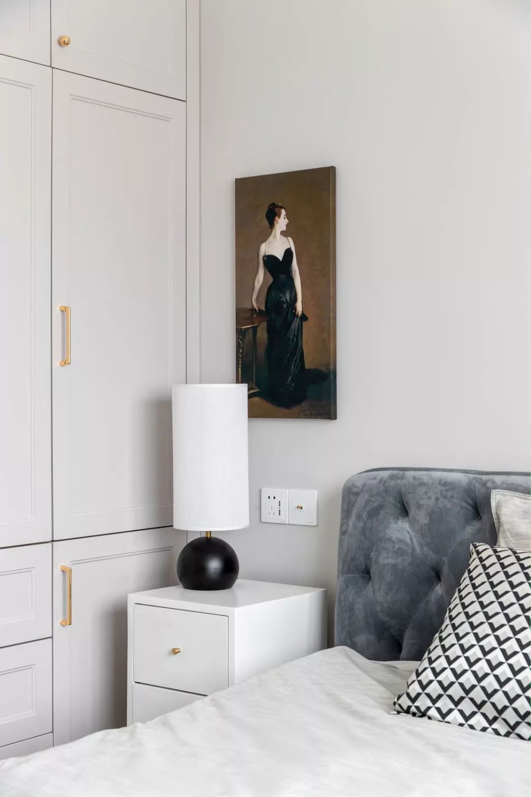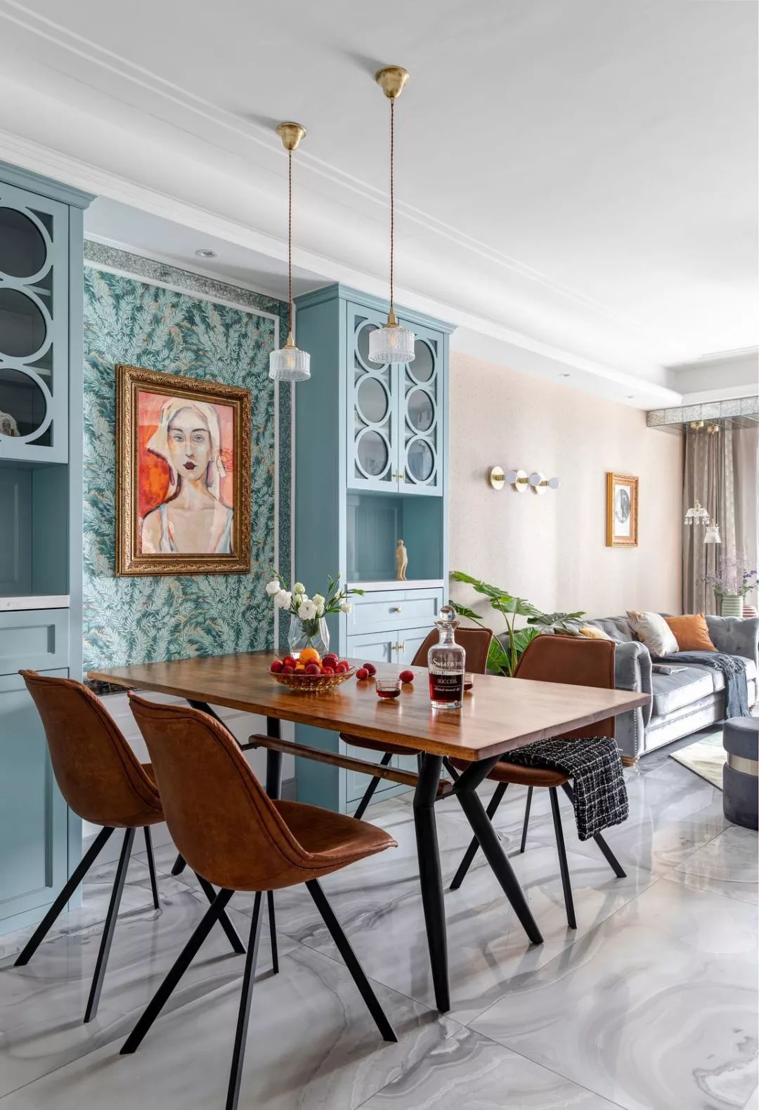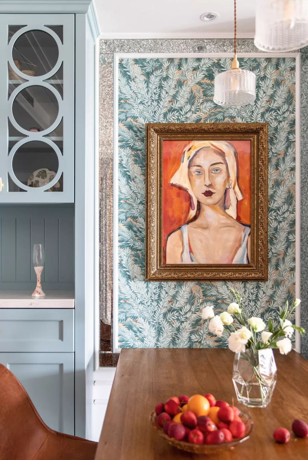 餐厅背景的装饰画,一副暖色调人物画像,特意找了画师绘制,与墙纸和柜体色彩形成反差对比,画框也通过小样,多次对