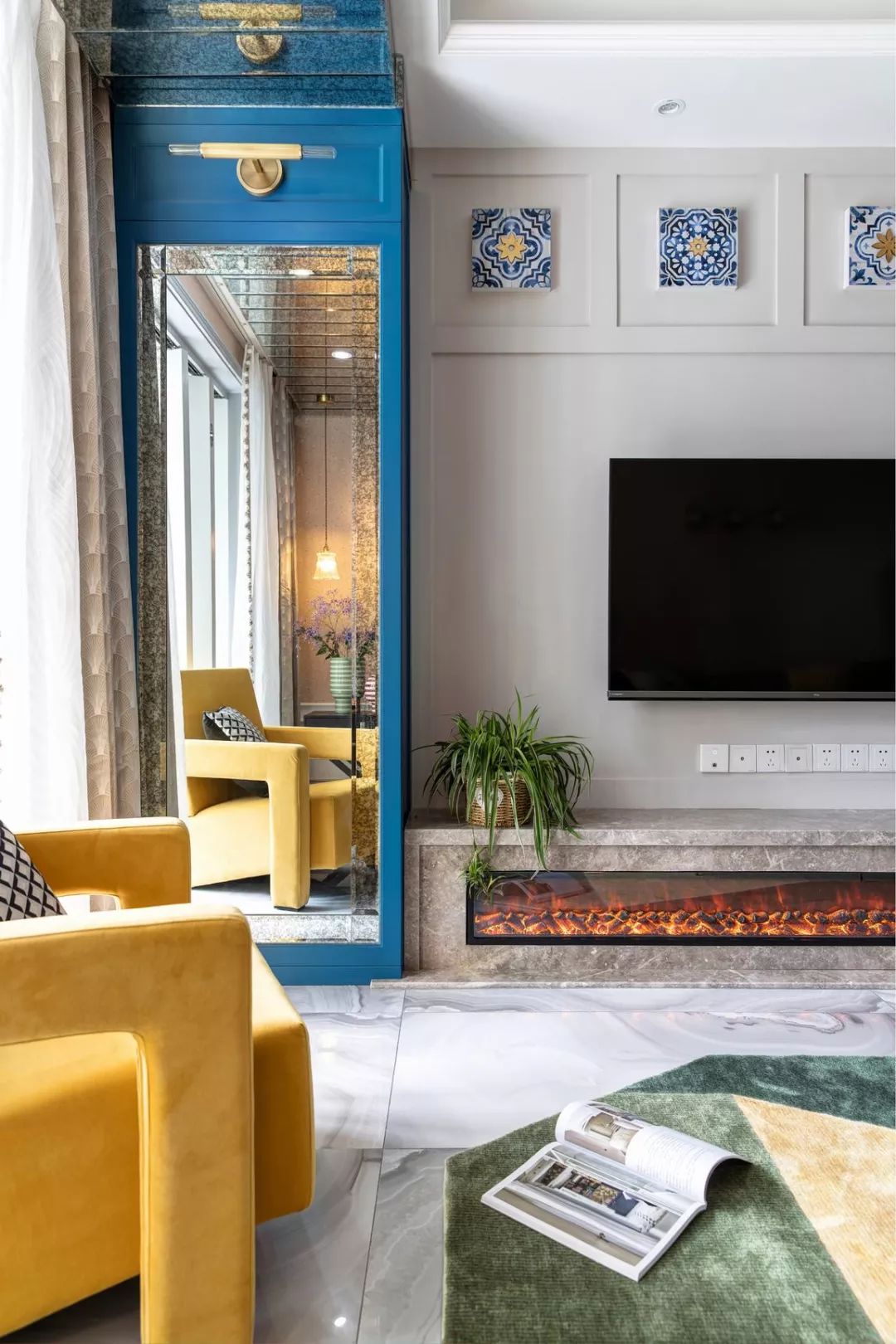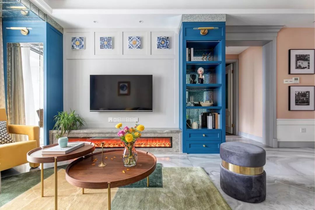 的展示收纳柜,中间嵌入大理石壁炉台面,暖色的火焰,在深蓝色的柜体中间,更加的耀眼灵动。