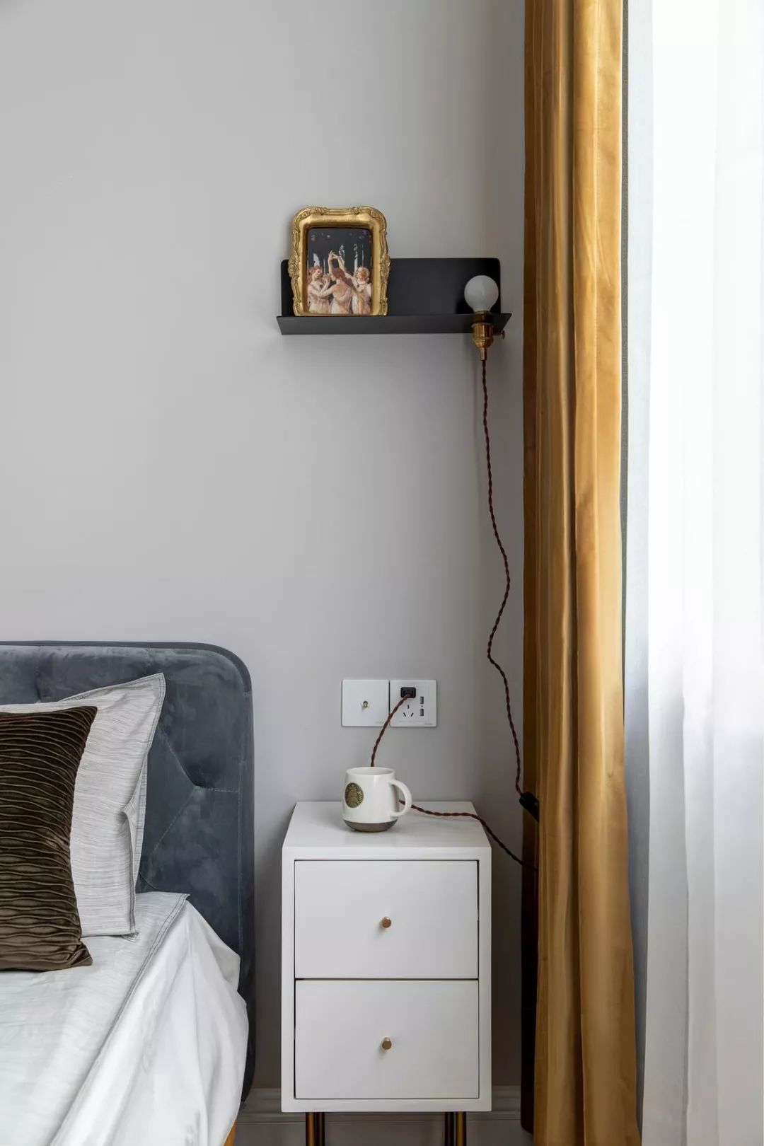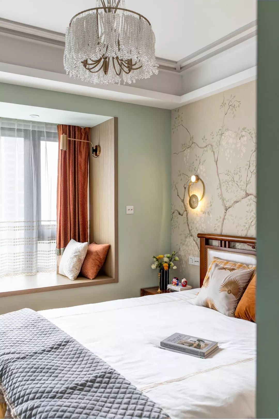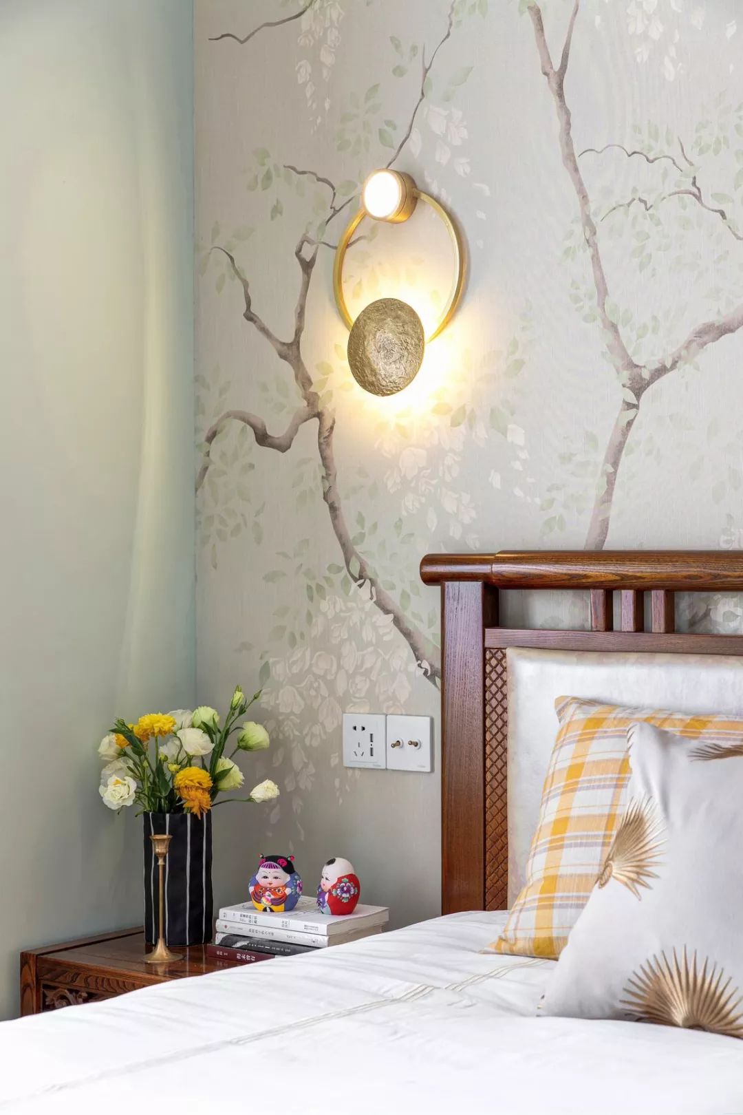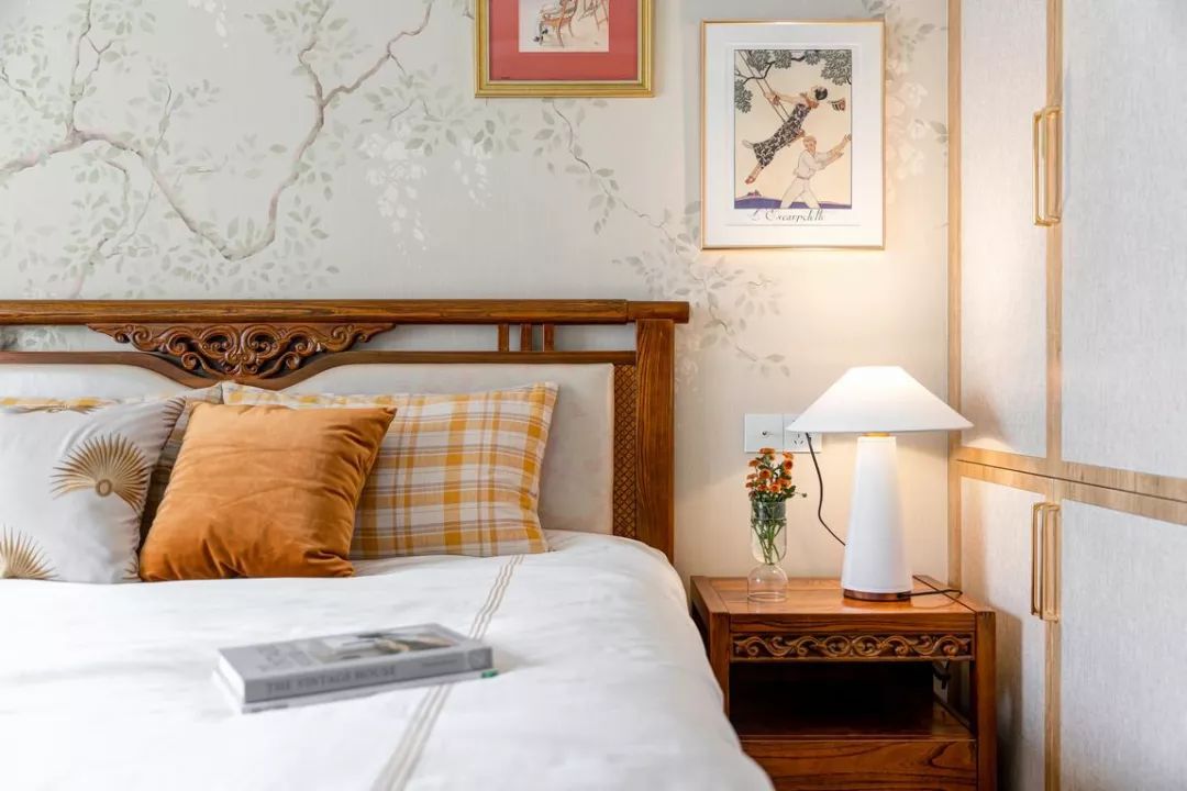 床头壁灯也是别具复古特色的,搭配花鸟壁纸,意境悠长。
