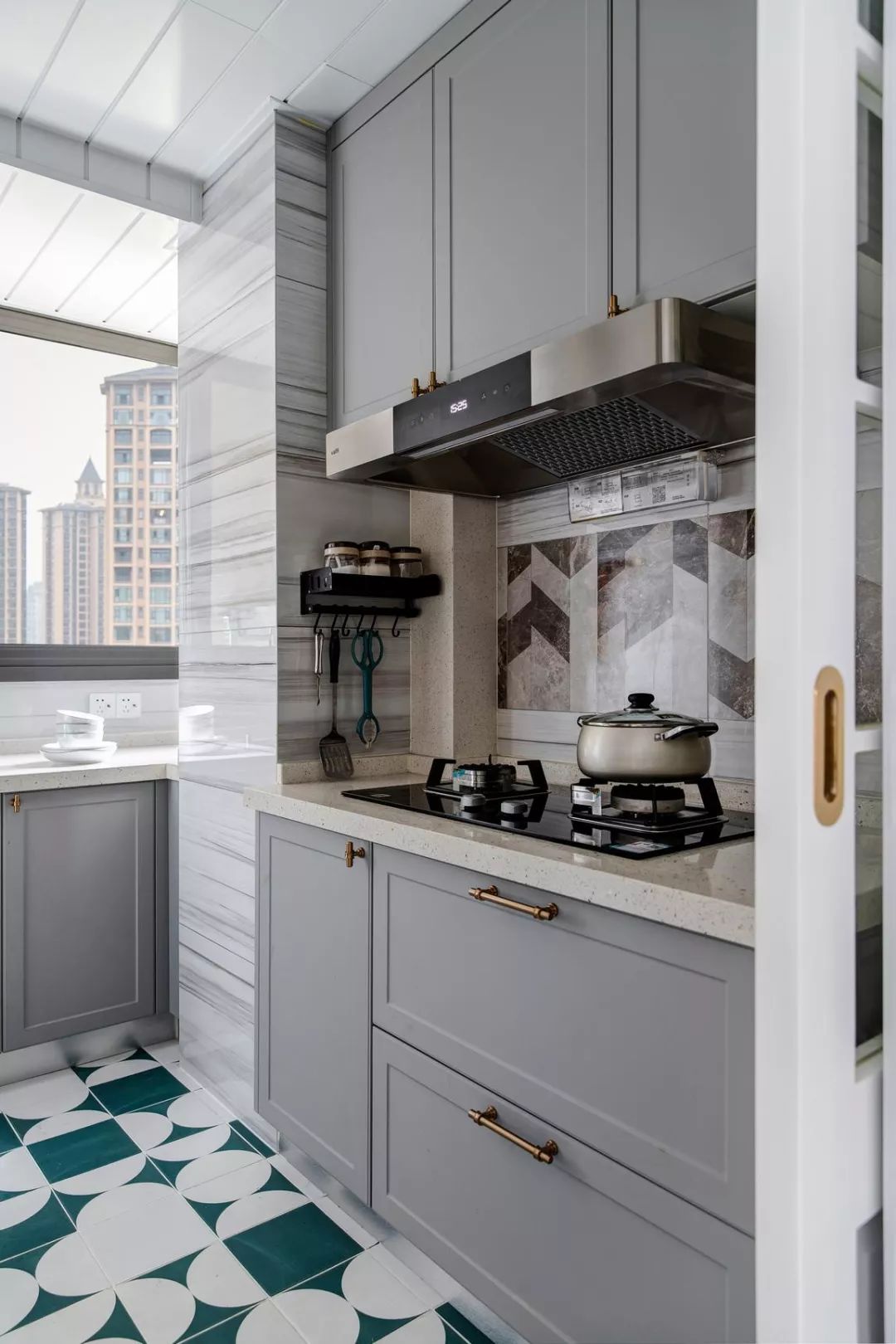 厨房地砖,选用了白色与绿色系列花砖混搭,看似不规律的搭配,实则来自设计师精心设计。