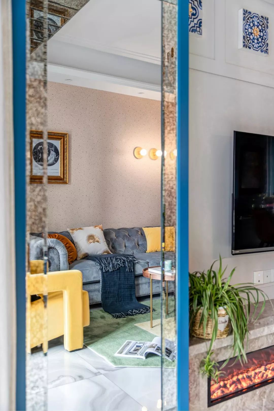客厅整体色彩层次丰富,但遵循统一呼应,沙发背景选用粉色壁纸,电视背景选用与餐厅浅蓝色柜体同色系的深蓝色,主吊
