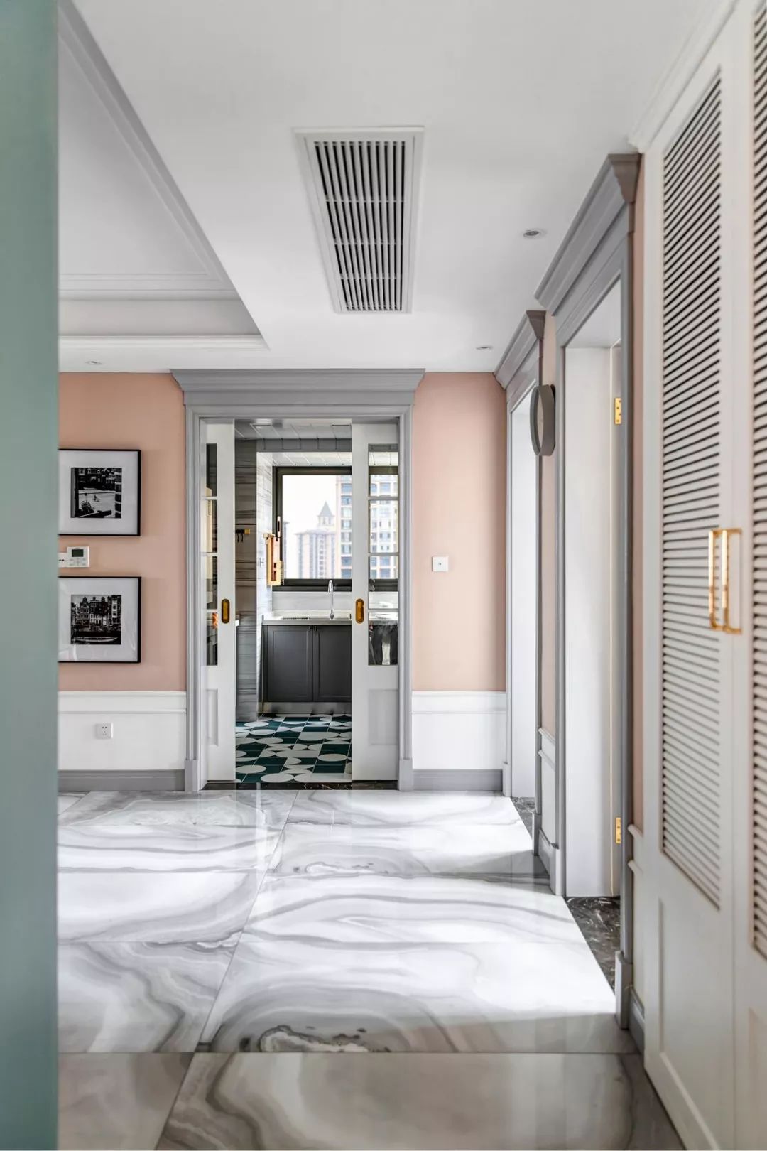 入户,并没有实际的过道,对景是厨房入口,将门头做到顶,并设计了帽头,几个门头整体统一;