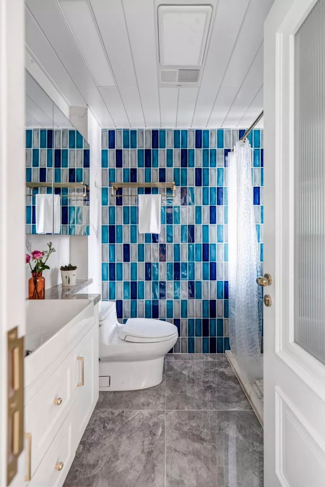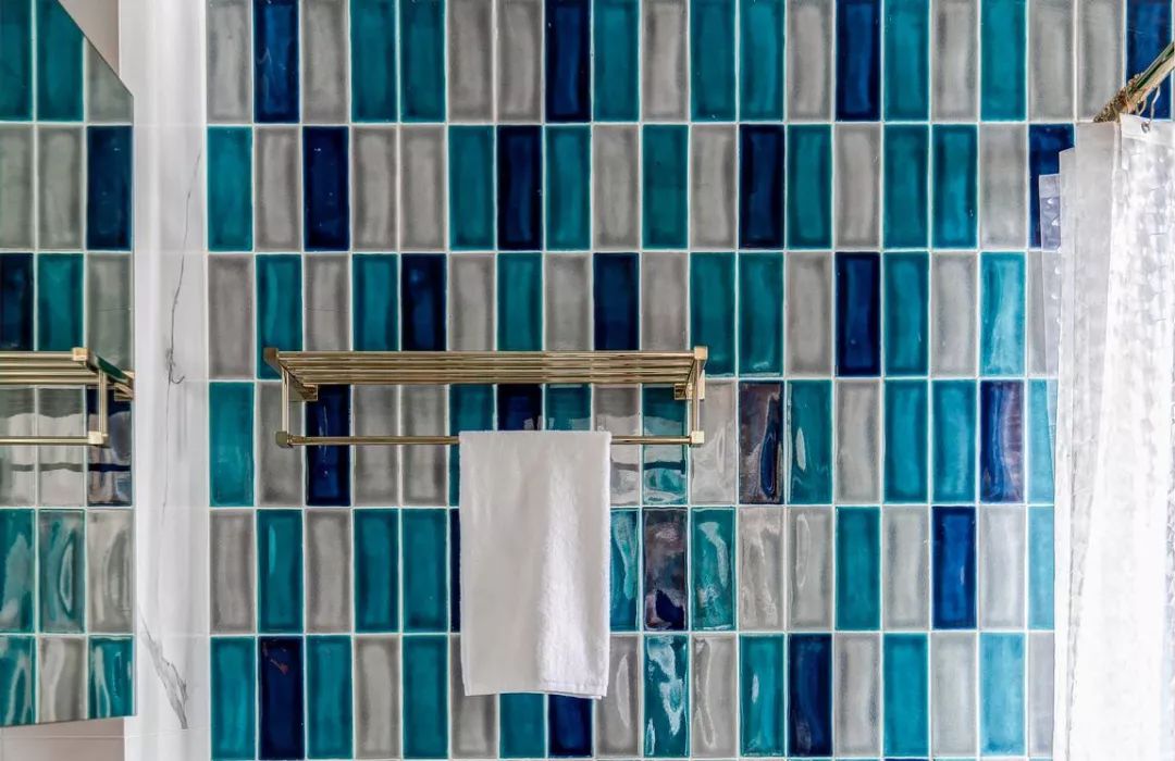 卫生间选用一整面小砖混拼,深蓝.湖蓝.浅灰,紧密有序,错落有致,色彩贯穿始终,一字排镜柜满足全家各种收纳,淋浴空